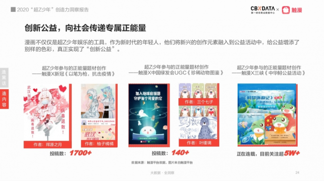 通过上面的一系列举措,触漫不仅营造了一个更良好的社区氛围,也为新时代的超Z少年提供了广阔和充满创造力的创作空间,让他们尽情的挥洒自己的个性和才能。据触漫联合第一财经商业数据中心CBNData发布的《2020“超Z少年”创造力洞察报告》显示,触漫站内的用户创作类型日益丰富,青少年在平台上创作的UGC条漫作品超过1亿,而正能量的创作作品数量也越来越多。实际上,这与触漫多个维度向青少年宣传社会主义核心价值观,弘扬中华民族伟大精神的引导和努力分不开,彰显出了触漫作为一个民营企业应有的责任与担当。
