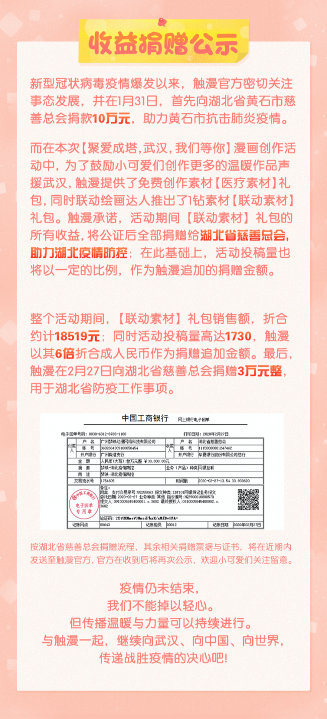 除此之外,触漫还上线了“聚爱成塔”爱心素材活动,号召更多的用户创作温暖的作品声援武汉,并以素材礼包销售额的 6 倍折合成人民币,和爱心素材收入一起作为捐赠湖北的抗疫金额。在疫情大考关头,触漫累计向湖北省黄石市和湖北省慈善总会捐赠了13万元资金、向广州市慈善总会和海珠区青创中心捐赠了17万元资金,用于帮助和支持各地防疫工作。
